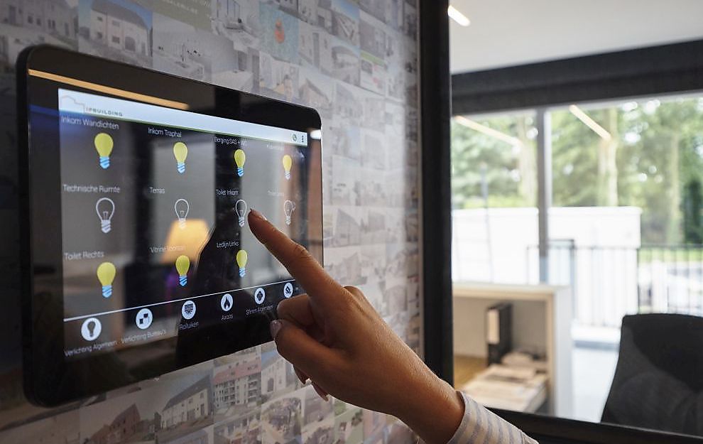 Projectontwikkelaar Intrabouw Lifestyle Buildings houdt graag de vinger aan de pols als het gaat om de verbetering van het leef- en werkcomfort, en dat begint bij het eigen kantoor. Voor de nieuwe uitvalsbasis in Sint-Niklaas werkte het Intrabouwteam dan ook samen met IPBuilding. De diverse technieken en aparte besturingen die de klassieke domotica-oplossingen boden, bleken immers te beperkt voor de hedendaagse èn toekomstige noden. IPBuilding, daarentegen, realiseerde met behulp van een moderne, universele bekabeling voor alle technieken en elektrische verbruikers en een beveiligd IP-netwerk één geïntegreerd informatienetwerk, bekabeld en draadloos, waardoor men een op elkaar afgestemde omgeving creëert voor data, beeld, spraak, automatisaties en communicatie. Alle slimme technieken en toestellen worden verzameld op één gebruiksvriendelijk platform en aangestuurd vanop 1 aanraakscherm: een grote, elegante touchscreen, centraal geplaatst in de kantooromgeving. Zaakvoerder Stefaan Maes is alvast overtuigd van de grote gebruiksvriendelijkheid van het systeem. Hij bedient het systeem vanop afstand via zijn smartphone en kan indien nodig de instellingen aanpassen of specifieke sferen creëren.