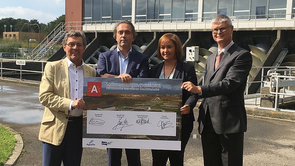Kan het afvalwater van 200.000 Antwerpenaars 7 megawatt aan energie opleveren? De stad Antwerpen wil het voortouw nemen in duurzaam verwarmen en gaat samen met Aquafin en Eandis deze piste in detail onderzoeken. Er wordt een detailstudie uitgevoerd om te onderzoeken of de restwarmte van het afvalwater in het waterzuiveringsstation van Deurne omgezet kan worden in energie om meerdere woningen te verwarmen. Het gaat daarbij meer bepaald om woningen in de nieuwe wijk ‘Slachthuissite’ én op termijn ook in de wijken Stuivenberg en Dam. Waar de huidige warmtenetten in Vlaanderen voornamelijk restwarmte van industriële activiteiten gebruiken om meerdere woningen te verwarmen, ligt de focus hier op de restwarmte die vrijkomt bij de zuivering van huishoudelijk afvalwater. In Deurne wordt het rioolwater van bijna 200.000 Antwerpenaars gezuiverd. Dit water heeft een hogere temperatuur dan het oppervlaktewater. De restwarmte kan na de zuivering van het water met een warmtepomp op een hogere temperatuur gebracht worden. Jan Goossens, algemeen directeur Aquafin: “Afvalwater is rijker aan grondstoffen en energie dan je denkt. Aquafin is al langer betrokken bij onderzoek naar recuperatie van bijvoorbeeld fosfor en koolstof. Met dit project zetten we een nieuwe stap om de zuivering van afvalwater in te passen in een circulaire economie.” De omvang van het project is uniek voor Vlaanderen. Het zou de eerste keer zijn dat er op zo’n grote schaal warmte wordt gewonnen uit gezuiverd huishoudelijk afvalwater. In theorie gaat het om een totaal thermisch vermogen aan warmtepompen van 7 megawatt. Eens operationeel zal het systeem dankzij het rioolwater van o.a. douches en afwasmachines een hele wijk kunnen verwarmen. Dat is niet onbelangrijk in het licht van de klimaatdoelstellingen, want er kan zo jaarlijks tot 4.000 ton CO2-uitstoot vermeden worden. Foto: © Liesbet Brzyk