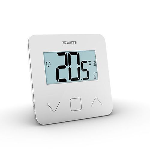 De nieuwe digitale kamerthermostaat BT-D03 RF is een uitbreiding op het WATTS Vision® smart home thermostaatsysteem, geschikt voor zowel verwarming als koeling en uitbreidbaar tot 50 zones. Het eenvoudige, niet-programmeerbare en draadloze toestel is voorzien van een volledig nieuw design, groot display en capacitieve aanraaktoetsen. Dankzij de draadloze koppeling is de BT-D03 RF eenvoudig te configureren, en ook de bediening spreekt voor zich: de gewenste kamertemperatuur kan via de thermostaat zelf of via de mobiele app ingesteld worden. Het toestel is voorzien van een muurbevestiging en kan ook vrij geplaatst worden dankzij de meegeleverde voet. Ook als individuele standaard kamerthermostaat is dit toestel geschikt.
