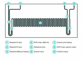 “They consist of two glass plates, with channels, mixers, pre-heating and quenching areas etched into them using photolithography. The plates are then bonded together. The micro reactors can be heated or cooled by putting them on small, electronically controlled Peltier devices. And they are mounted in a small holder to make the necessary connections. Changing the pump rate and the reactant ratio provide more possibilities to change reaction time and other characteristics."
